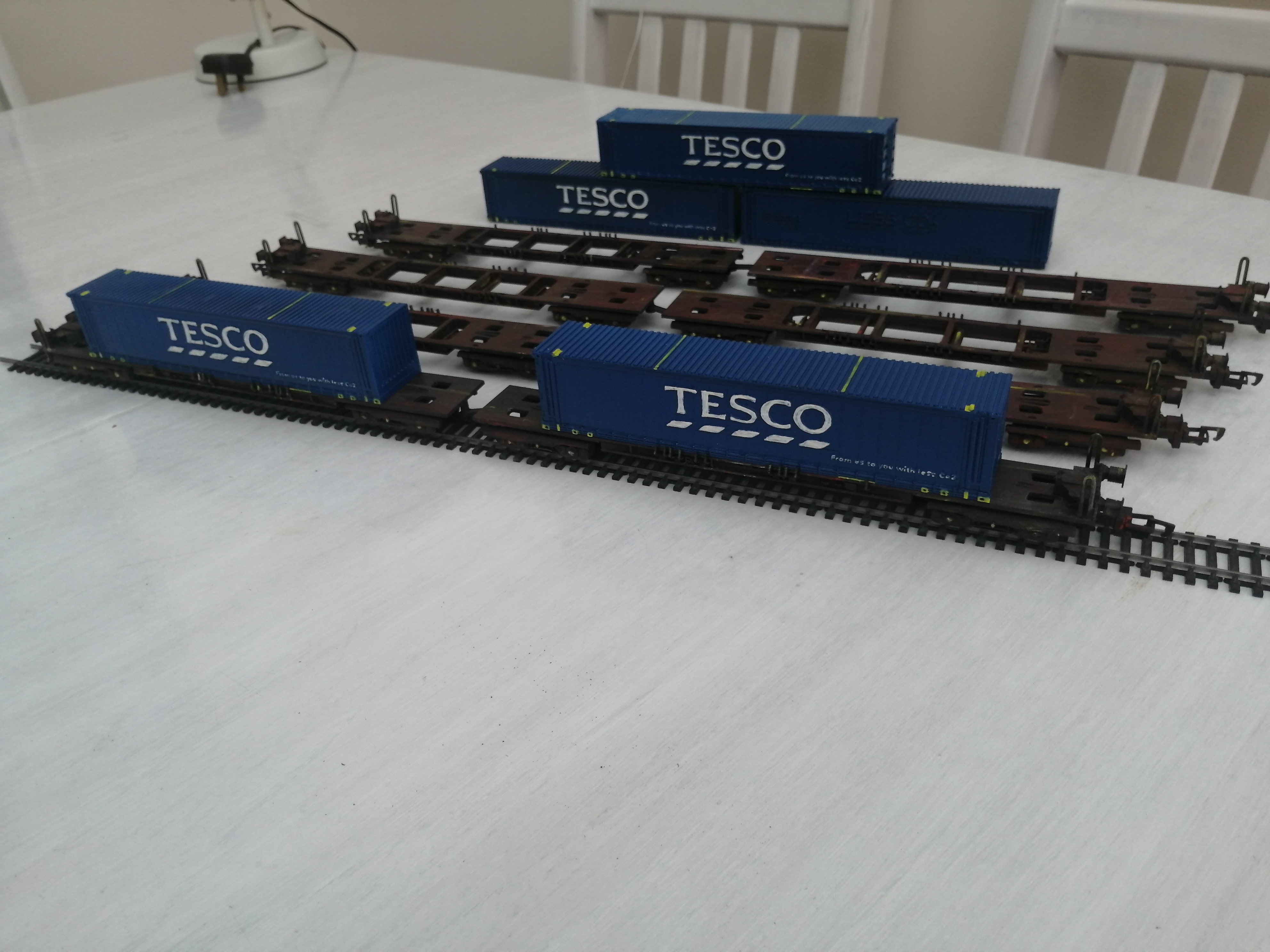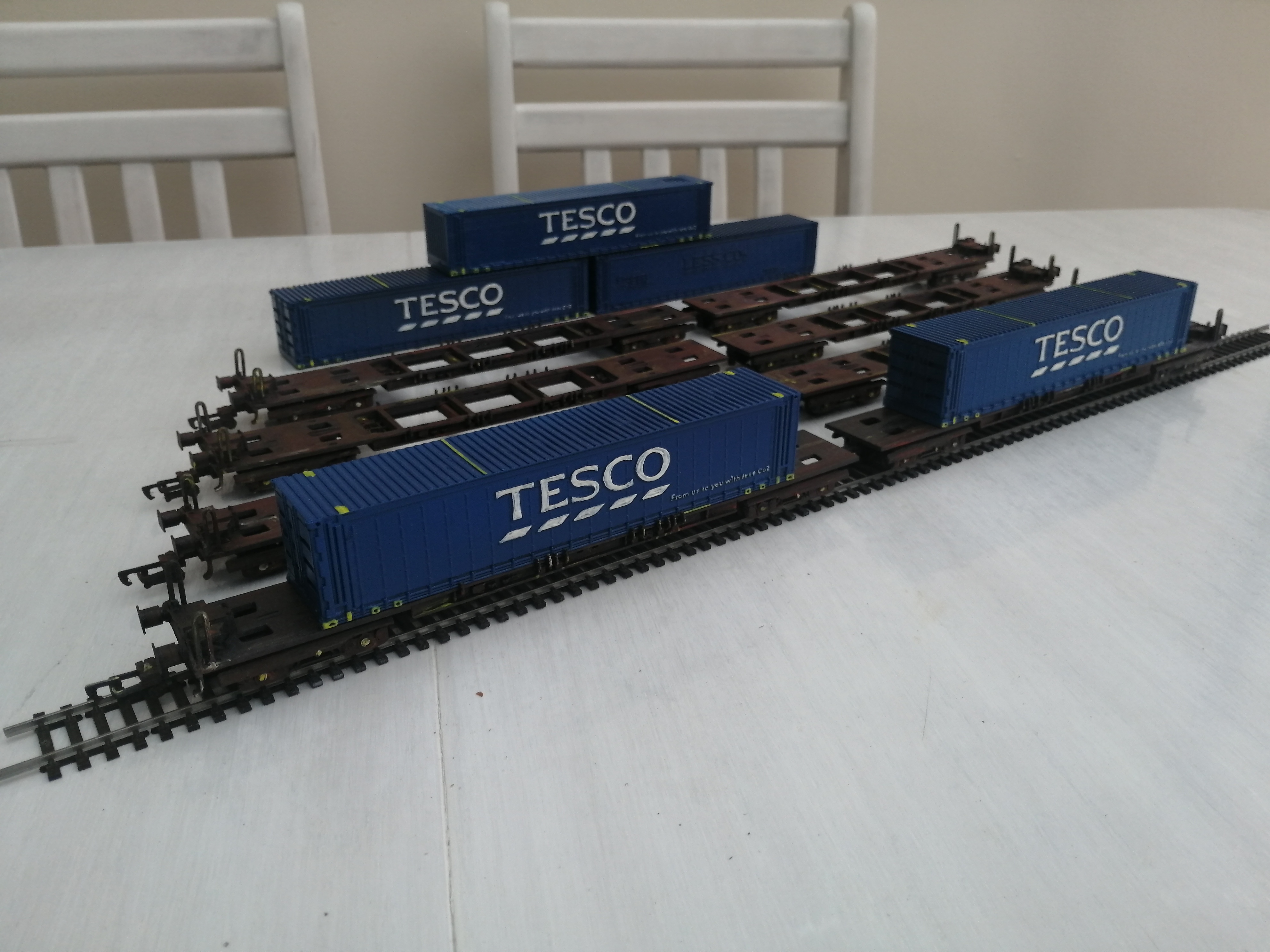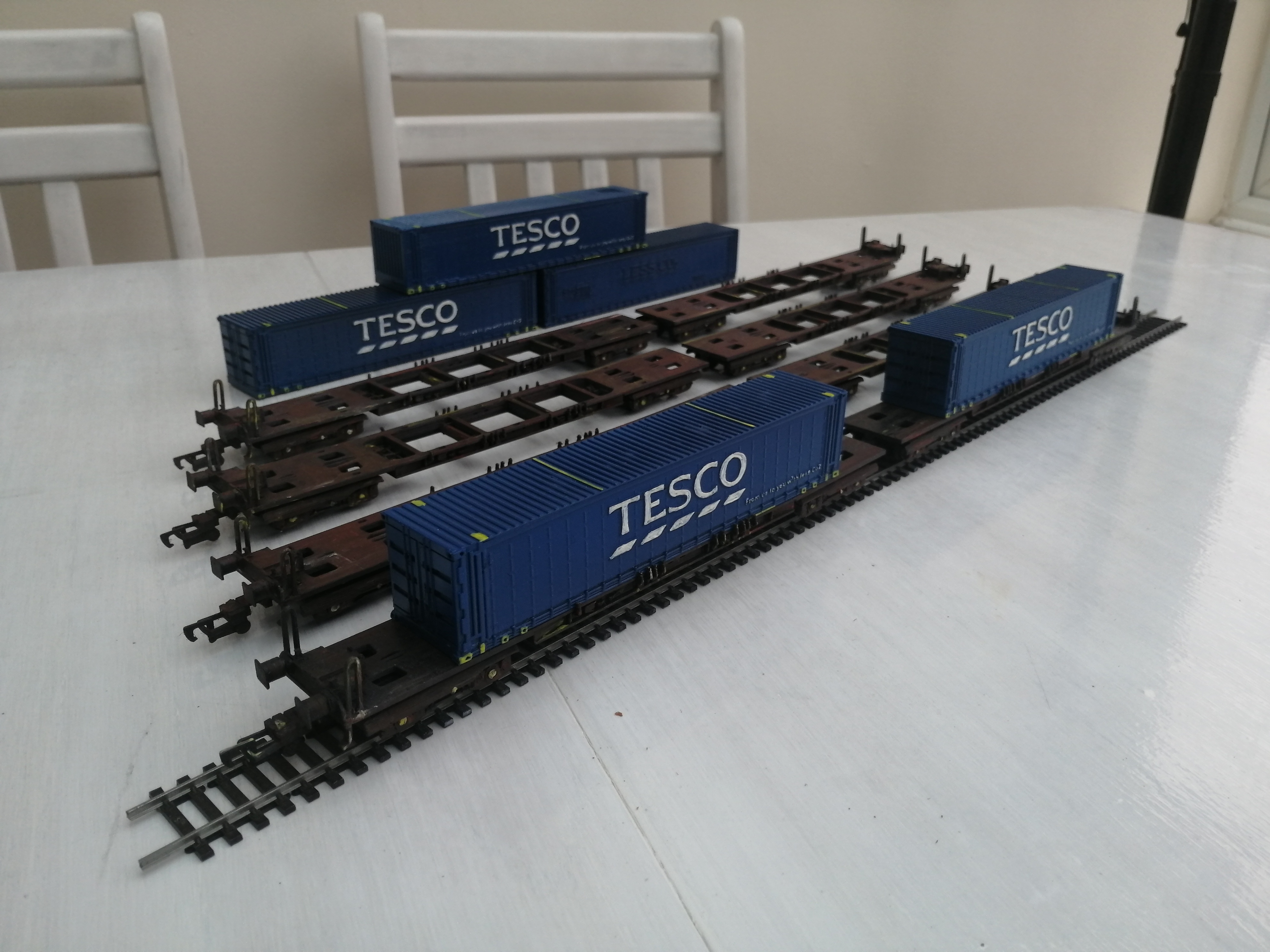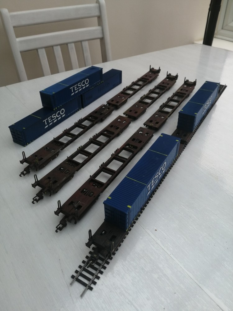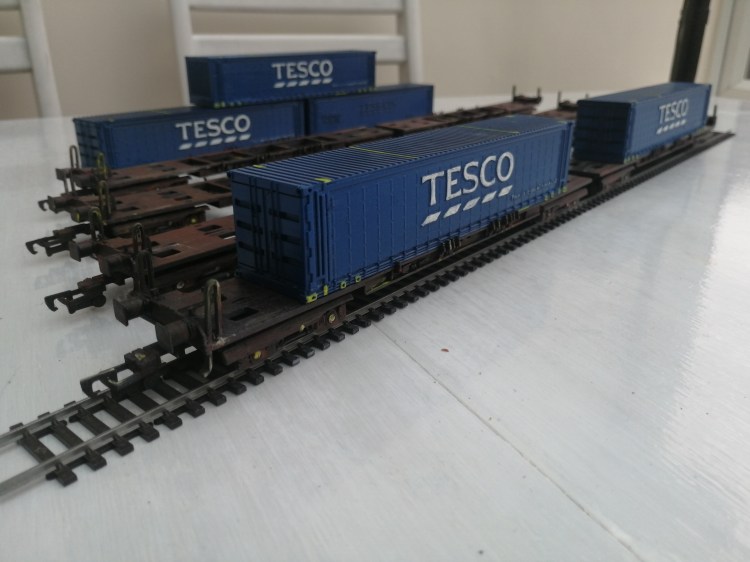 Fully Assembled, painted with weathering – £35, This includes the front and back wagons and two containers. Wagons are spray painted and weathered using acrylic paints and the containers spray painted blue with yellow details.